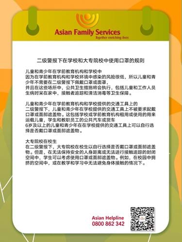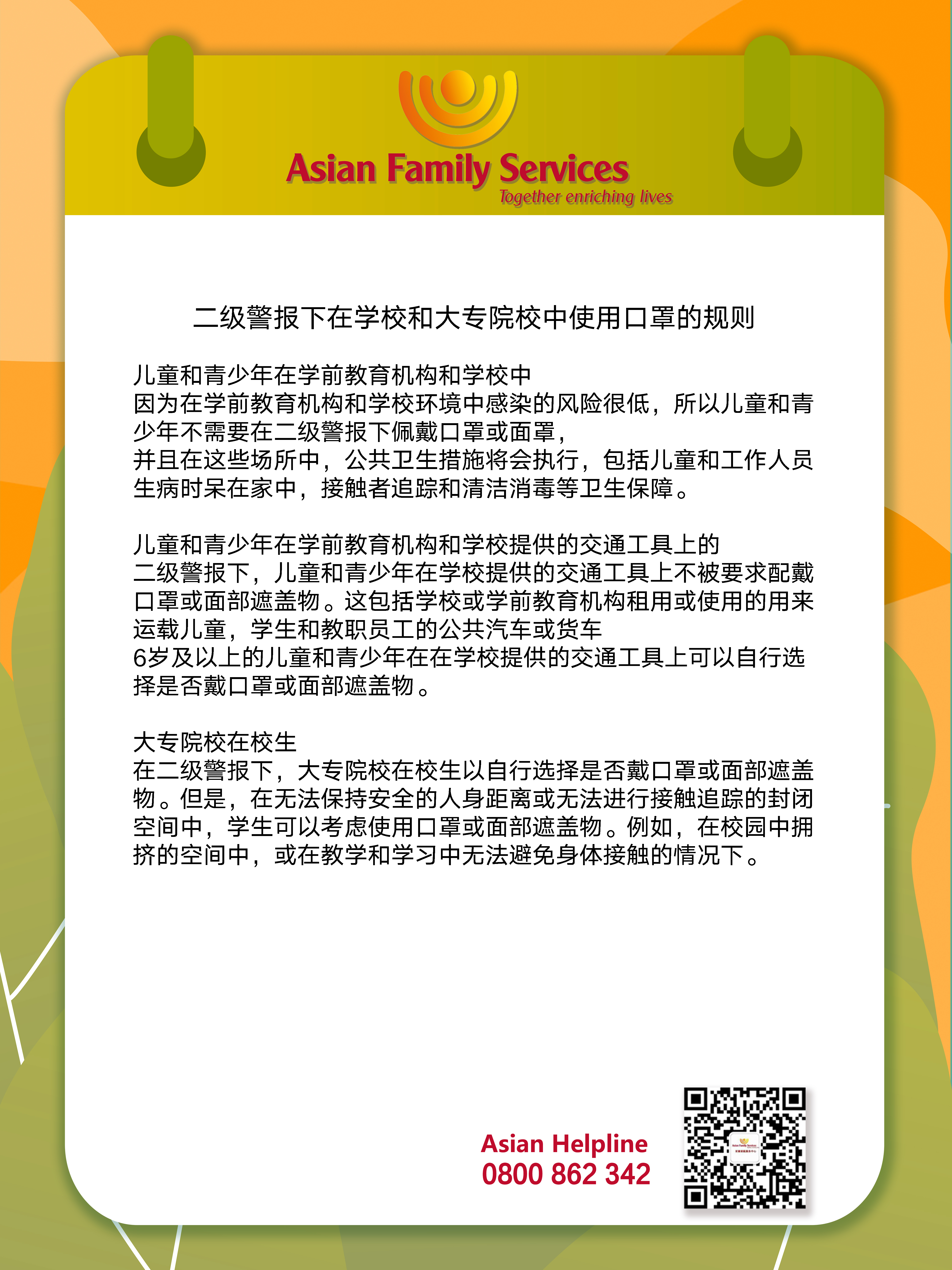 在二级警报下,大专院校在校生以自行选择是否戴口罩或面部遮盖物。但是,在无法保持安全的人身距离或无法进行接触追踪的封闭空间中,学生可以考虑使用口罩或面部遮盖物。例如,在校园中拥挤的空间中,或在教学和学习中无法避免身体接触的情况下。